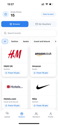 5. Spend your points across 190+ partner brands This is where it gets genuinely exciting. Kindo's partner network includes Boots, Nike, Amazon, Hilton, M&S, H&M and 180+ more - everything from groceries and fashion to hotel stays. Scan the barcode in-store or enter your code online, and your voucher works just like a debit card. Or, save your points and put them toward a family holiday.