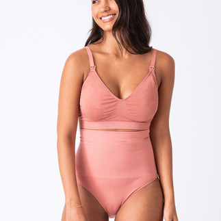 A beautiful blush lace nursing bra that combines elegance with functionality, providing gentle support and easy breastfeeding access.